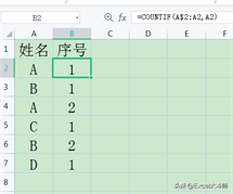 1.按条件出现次数顺序编号 =COUNTIF(A$2:A2,A2)