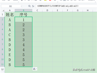 4.不重复计数编号 =SUMPRODUCT(1/COUNTIF(A$2:A2,A$2:A2))