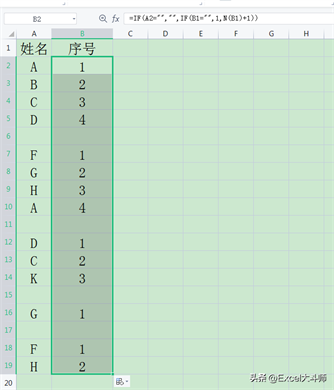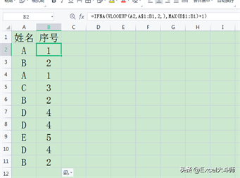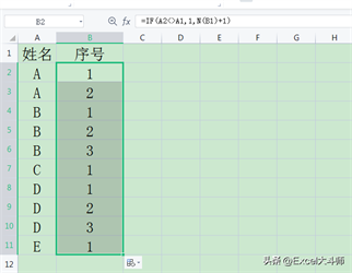 5.相同数据顺序编号(针对数据源排序好的) =IF(A2<>A1,1,N(B1) 1)