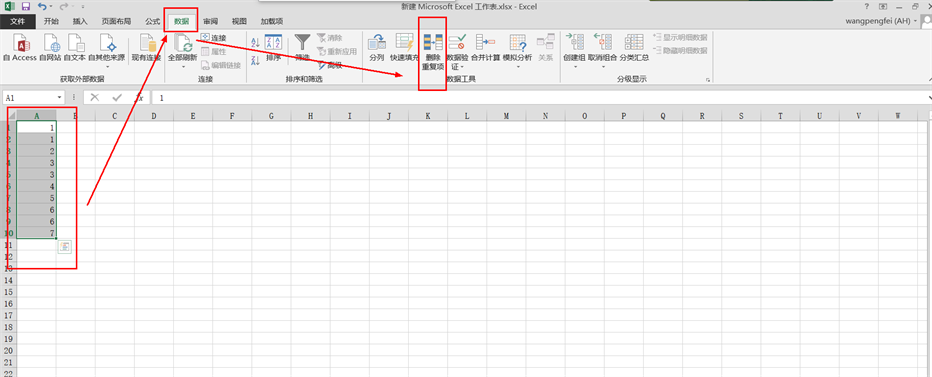 二、选择要去重的数据,点击“数据”,找到“删除重复项”这个功能项,点击进入下一步;