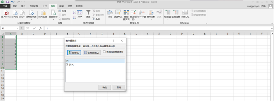 三、选择要删除重复项的列,点击确定即可;
