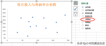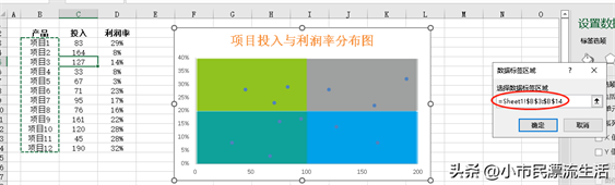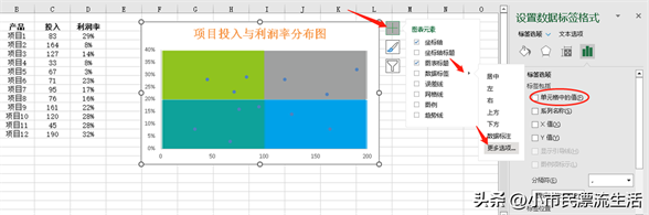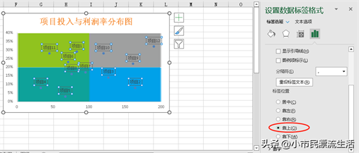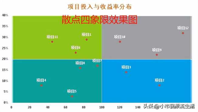 此时根据项目在图表中的区域分别,可以直观看出那些项目数据高投入高利润率、高投入低利润率、低投入高利润率、低投入低利润率。