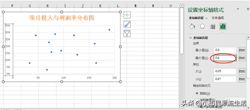 左键单击选中纵坐标轴,单击右键在菜单类别选择【设置坐标轴格式】,接着在页面右侧将*坐标轴选择*最大值设置为0.4(使其成为对称的偶数值)。