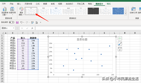 选中基础散点图,选择功能区的【图表设计】选项卡,在下列的*图表样式*分组中可以选择软件内置的心仪的样式。