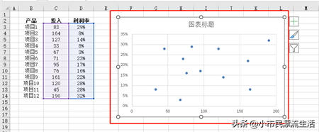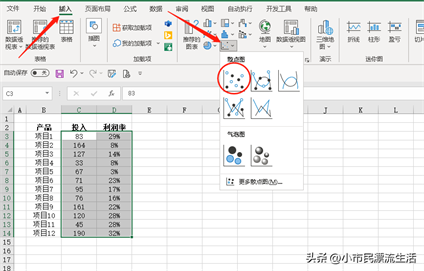 插入散点图与插入其他图有所不同,在插入散点图之前必须选中数据,而且只能选中数据不能包含标题列,否则就无法形成需要的坐标点。