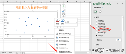 左键单击选中绘图区,单击右键调出菜单,选择【设置绘图区格式】,在页面右测*填充*分组中选择【图片或纹理填充】。