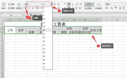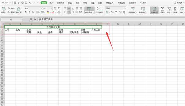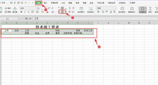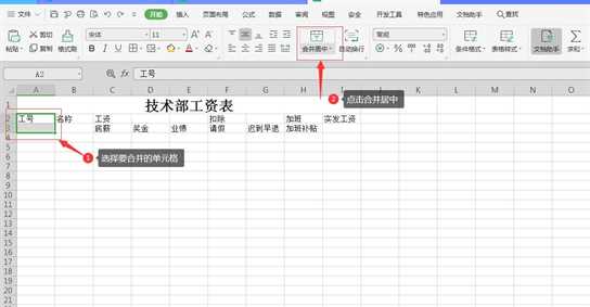 2、选择技术部工资表这行,然后“合并居中”,调节字体大小到合适大小