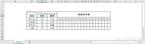 4、最后在E2:V3单元格中输入“身份证号码”– 在下方的小格中输入对应的身份证即可。