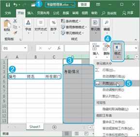 Step01 选择菜单命令。新建一个空白工作簿,并命名为【考勤管理表】,在A4:C4和D3单元格中输入相应的文本内容,选择D:AH列单元格,单击【开始】选项卡【单元格】组中的【格式】按钮,在弹出的下拉菜单中选择【列宽】命令,如图1-2所示。