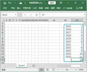 Step05 输入辅助数据。在当前工作表中估计不会用到的空白区域中输入多个年份(本例中输入年份为2015~2025)及月份数据作为辅助列,方便后面调用,如图1-6所示。