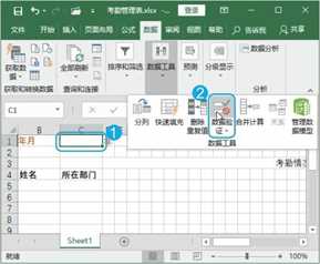 Step06 执行数据验证操作。选择C1单元格,单击【数据】选项卡【数据工具】组中的【数据验证】按钮 ,如图1-7所示。