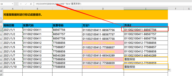 E4单元格公式=IF(COUNTIF($D$4:D4,D4)=1,B4&”-“&C4,”重复报销”),解释: