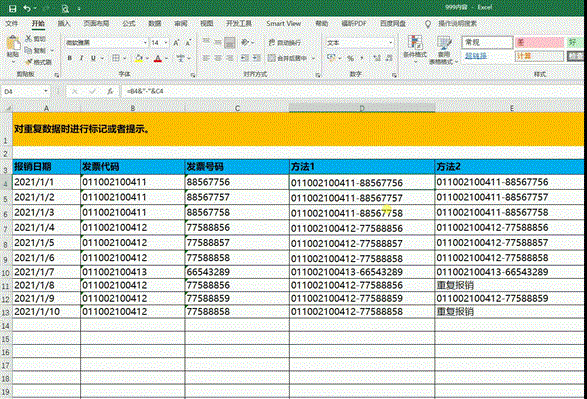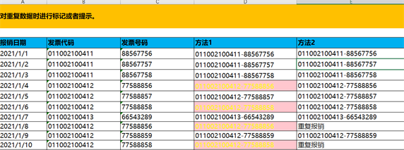 最佳答案案例:电子发票登记台账,登记电子发票避免重复报销,介绍2种方法,实现效果如下:方法1:利用条件格式,对重复值进行标记,操作如下:条件格式-突出显示单元格规则-重复值;通过条件格式-管理规则,可以看到设置的显示重复值的规则,并对其进行需求修改。方法2:利用公式,出现重复值时,提示“重复”。E4单元格公......