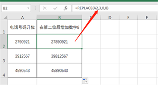 除了使用REPLACE函数,当然也可以用其他函数来完成,比如输入公式=LEFT(A2,2)&8&RIGHT(A2,LEN(A2)-2)