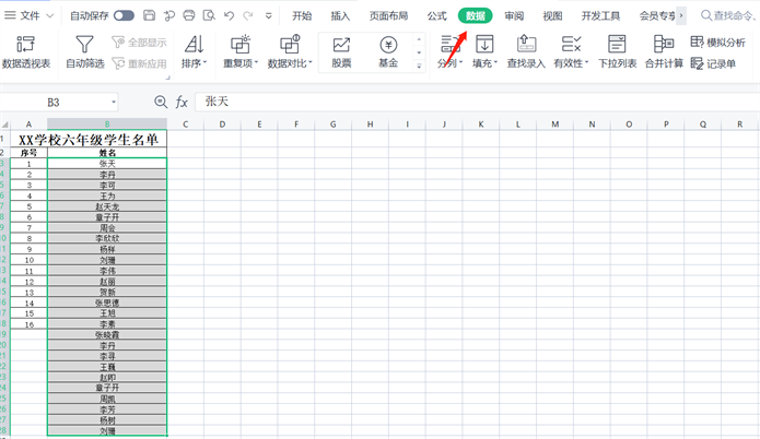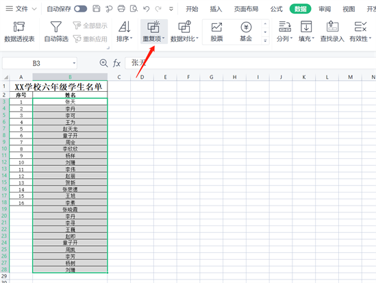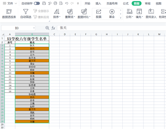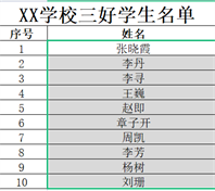 2.选中粘贴上三好学生名单的姓名列所有学生姓名(不含标题)