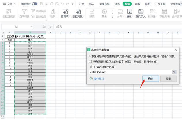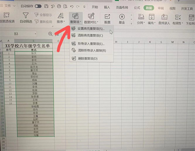 3.依次点击数据-重复项-设置高亮重复项-确定;