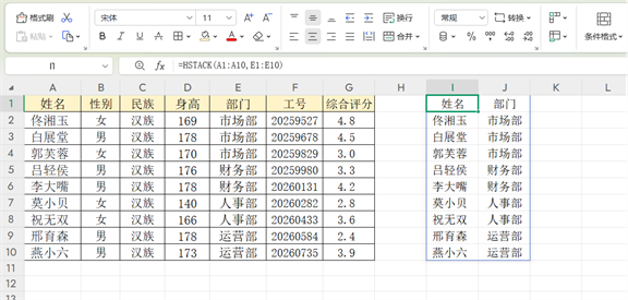 举个简单的例子,要是我们想把“姓名”列和“部门”列合并成一个新的表格,只需要输入公式=HSTACK(姓名列区域,部门列区域),新表格就会立刻生成,省去了繁琐的复制粘贴步骤。
