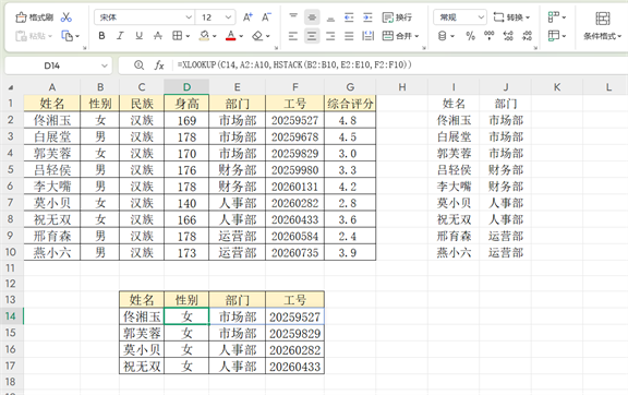 比如,我们要根据“姓名”查询对应的“性别”“部门”“工号”。首先,用HSTACK函数提取这三列:HSTACK(性别列区域,部门列区域,工号列区域)。然后,结合XLOOKUP函数进行查询,公式为=XLOOKUP(查询的姓名,姓名列区域,前面HSTACK得到的结果)。这里要注意的是,HSTACK函数中各列的顺序要和我们想要的查询结果表头顺序保持一致,不然查询出来的数据就会出现错位。