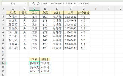 比如,要筛选出“身高170以下”的员工的“姓名”和“部门”。首先,用HSTACK函数整合这两列:HSTACK(姓名列区域,部门列区域)。然后,用FILTER函数添加筛选条件,公式为=FILTER(前面HSTACK得到的结果,身高列区域<170)。