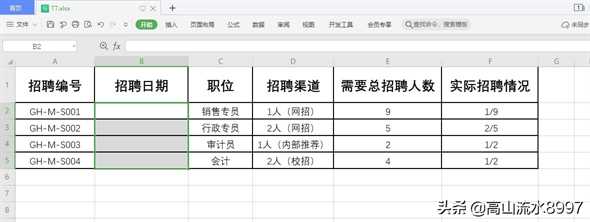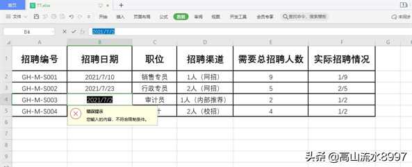 五、点击〖确定〗后,在表格中录入的招聘日期,只能在2021/7/5-2021/11/15范围内,若不在指定的日期期间,则表格录输入招聘日期后,就会弹出〖错误提示〗窗口,如图。