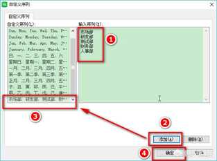 步骤2:输入“市场部、研发部、测试部、财务部、人事部”,每一个词之间用Enter键分隔,接着点击“添加”,这时就会在左侧的自定义序列中看到这个序列。