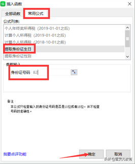 3.在弹出的插入函数对话框。选中常用公式,下面公式列表的提取身份证生日。在参数输入身份证号码中输入身份证号码的第1个,例子中是输入了b2。其中这个b2大写和小写都是一样的,都可以。然后点击确定。
