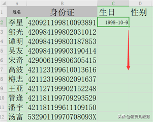 4.确定之后会返回表格。我们可以看到生日信息已经自动填进去了。,我们只需要向下填充,就可以得到全部的生日信息了。