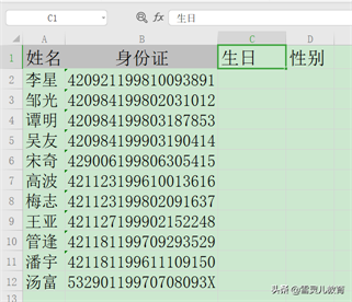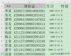 6.看一下最后的结果,我们没有输入任何的函数,就直接一键提取了身份证中的生日和性别信息。
