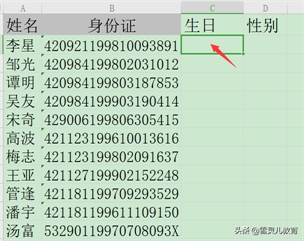 1.首先点击需要提取生日信息的单元格。例子中是选中了生日标题下的第1个单元格。