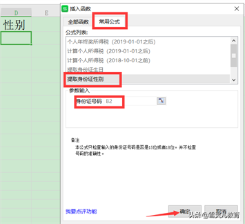 5.需要提取身份证号码中的性别信息,原理是一样的。只需在插入函数对话框中,选中常用公式中的提取身份证性别。然后输入正确的身份证号码所在单元格的参数。点击确定,就OK了。