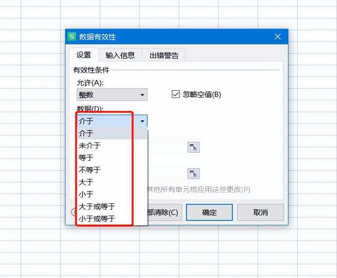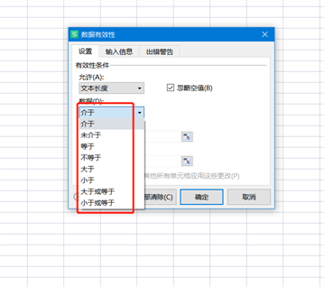 整数、小数、日期、时间:使用比较计算,以控制有效性(=,<>,>,>=,<,<=,介于,未介于)