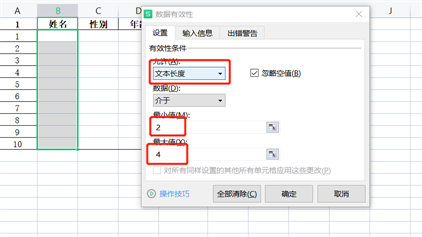 如下图所示,姓名一般都是2个字,最多 4个字。这个时候我们就可以使用文本的长度,在介于之间去选择。