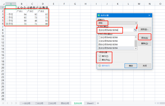 这个时候我们新建一个工作表,在空白区域进行合并计算。函数就默认求和,引用位置点后边的选取数据表,点击添加,勾选首行和最左列,点击确定即可。