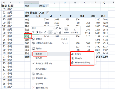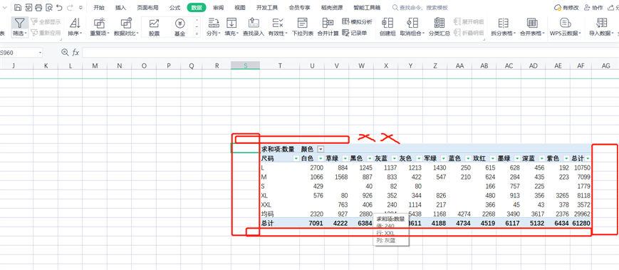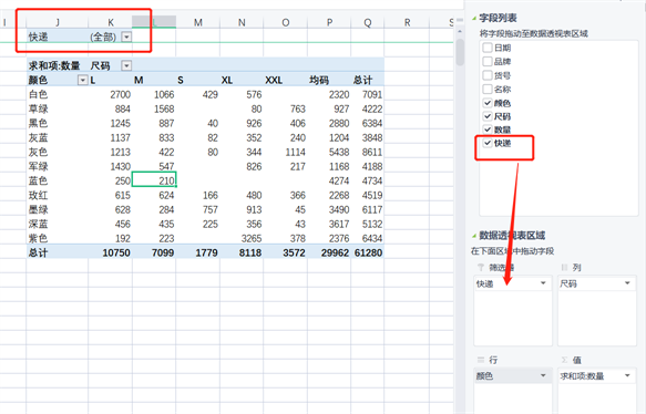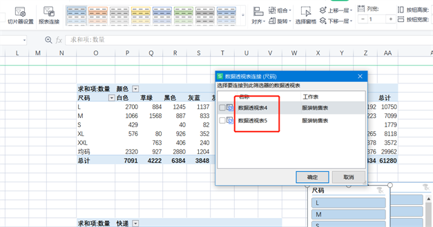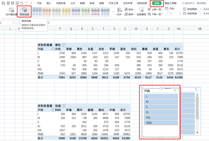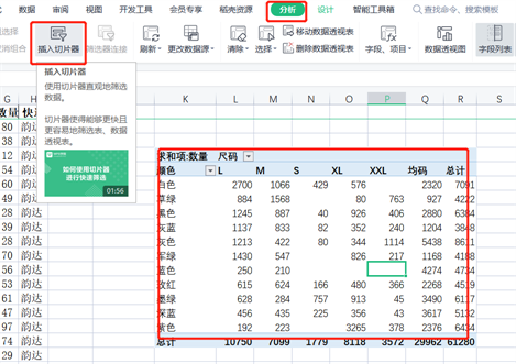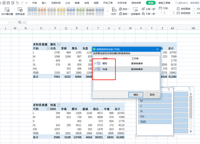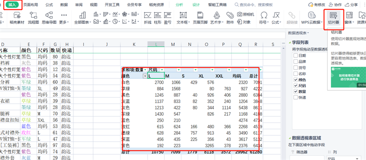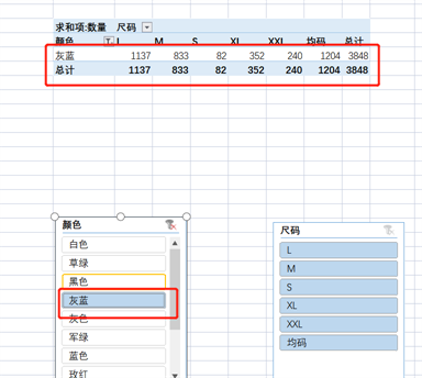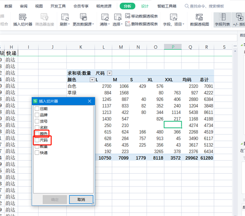 这里边我们选择尺码和颜色。切片器不适合数据比较多的字段,例如数量。