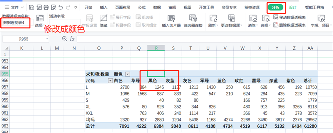 选中数据表字段—点击分析,可以看到透视表名称,我们修改成颜色,另外一个修改成快递。