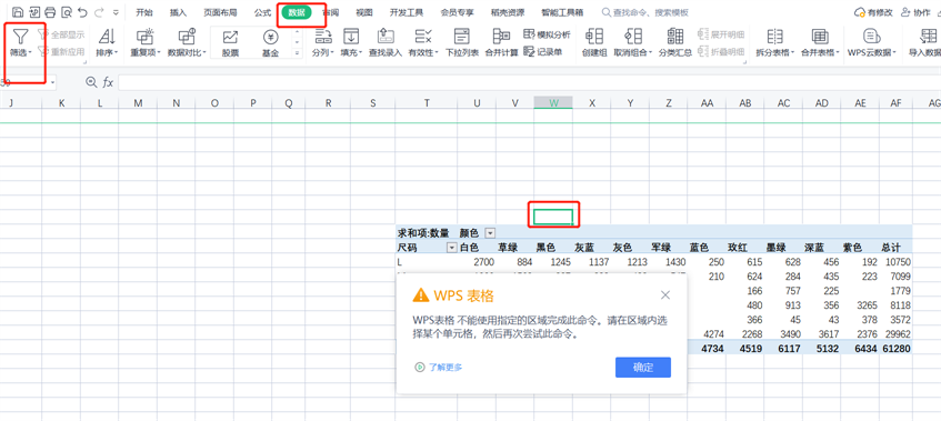 还有一种操作:数据——筛选。这个要重点讲一下,一定要定位这个数据表的四周附近,不能有空一行。例如:图片下方红色方框标注的都可以使用这个筛选。其他地方就会有提示。