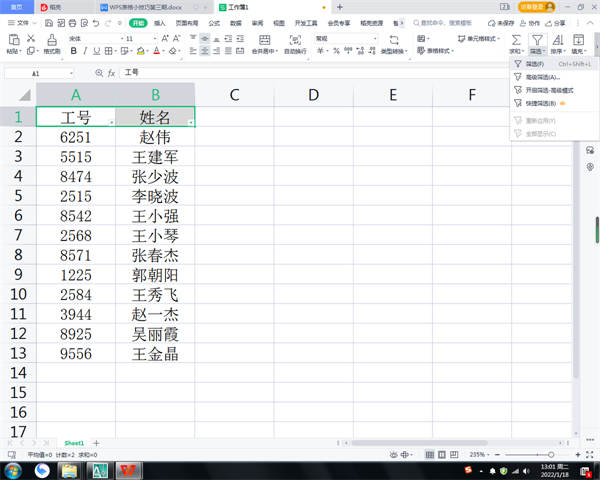 此类工作一般用在工资中筛选同一个姓用的比较多,有些负责汇总的时候,不小心会将所有的数据汇总在一起,那么重新筛选的时候会比较麻烦,一个一个筛选也会浪费时间,所以我们可以采用同时筛选来完成,那么让我们看看吧。