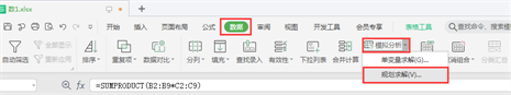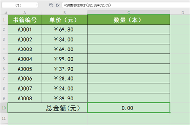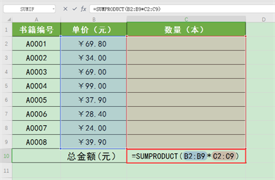 公式“=SUMPRODUCT(B2:B9*C2:C9)”意为B2到B9单元格中的单价分别与C2到C9单元格中的数量相乘,再将所有乘积相加求和。