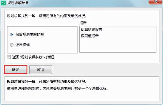 5.在弹出的“规划求解结果”对话框中保持默认设置,直接单击“确定”按钮。