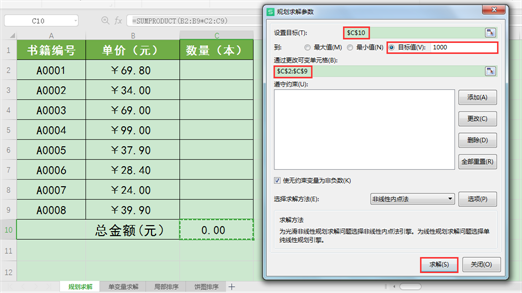 4.在打开的“规划求解参数”对话框中,将“设置目标”设为“$C$10”,将“目标值”设为“1000”(即采购预算总金额),在“通过更改可变单元格”编辑框中输入“$C$2:$C$9”,最后单击“求解”按钮。