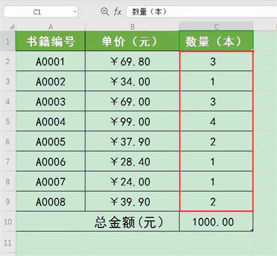 6.此时,可见工作表中C列中的内容已经发生变化,C2:C9单元格中自动计算出了同行所对应的书籍分别应采购的数量。