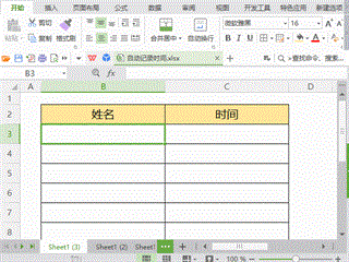 公式:=IF(COUNTA(B3:D3)=3,IF(E3=””,NOW(),E3),””)