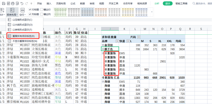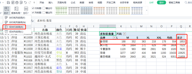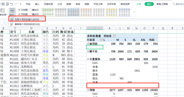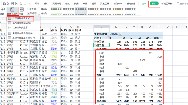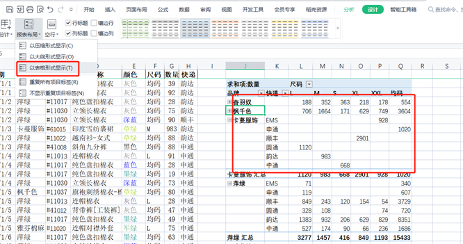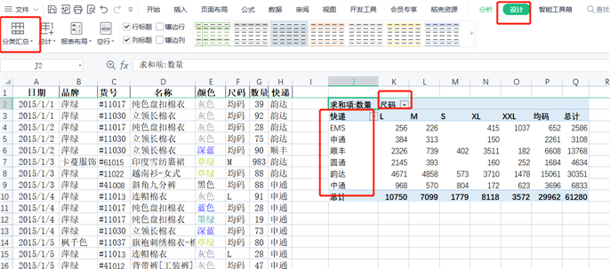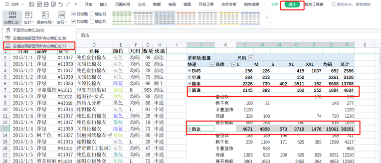 如果我们透视表行字段使用‘快递’一个区域,当我们点击设计——分类汇总三角下方的所有命令,都没有反应。只有当区域里有两个或两个以上的字段才有效果哦,这个一定要注意。