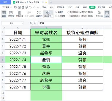 选中B5单元格后,该单元格对应的B列和第5行自动用带颜色的底纹突出显示。