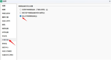接着,进行外部内容设置,在弹出的【选项】对话框左侧的列表中,仔细查找并点击【外部内容】这一项;然后在对话框的右侧区域,找到【禁止所有数据连接】这个选项并勾选上,最后点击【确定】按钮来保存刚刚设置的内容。