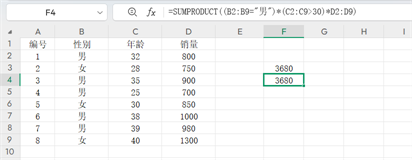 =SUMPRODUCT((B2:B9=”男”)(C2:C9>30)*D2:D9),无需严格区分区域。其亮点是支持动态筛选,与数据验证联动时能自动刷新结果,而SUMIFS处理这类场景需频繁修改公式。