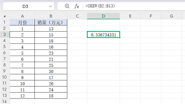 示例:计算B2到B13单元格的偏态系数,输入公式=SKEW(B2:B13),即可得到结果。