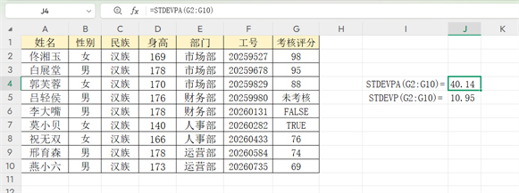 某企业有80名员工,其中8人标记“待入职”(文本)、6人标记“TRUE”(代表绩效优秀)。使用STDEVPA计算总体标准差后: