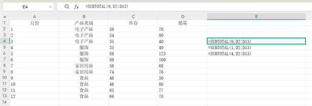 求和可表示为:=SUBTOTAL(9,D2:D13)