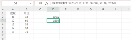 =SUMPRODUCT(A2:A6,B2:B6),函数就会自动计算每一行的“数量×单价”,然后将所有结果相加,无需手动添加辅助列。要是想筛选出“数量>10且单价>50”的商品销售额,公式=SUMPRODUCT((A2:A6>10)*(B2:B6>50),A2:A6,B2:B6)会先通过逻辑数组确定符合条件的行(不符合条件的会记为0),再进行求和,一步就能得到结果。